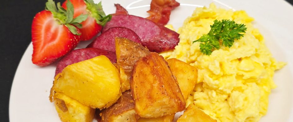 Scrambled eggs with sausage and bacon